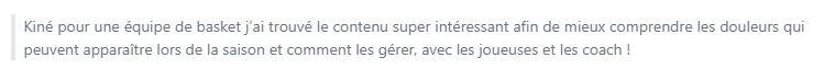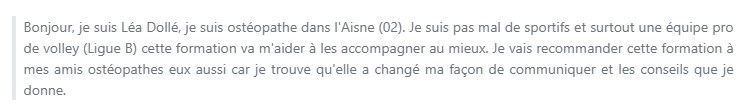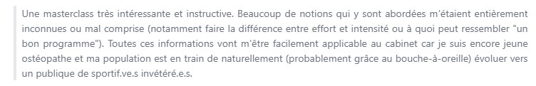 Ca m'a aidé à gagner en aisance (...) et me permet de discuter plus facilement avec les sportifs en surcharge d'entrainement.